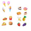 Formatos variados: frutas, doces, sorvetes, fast food e muito mais