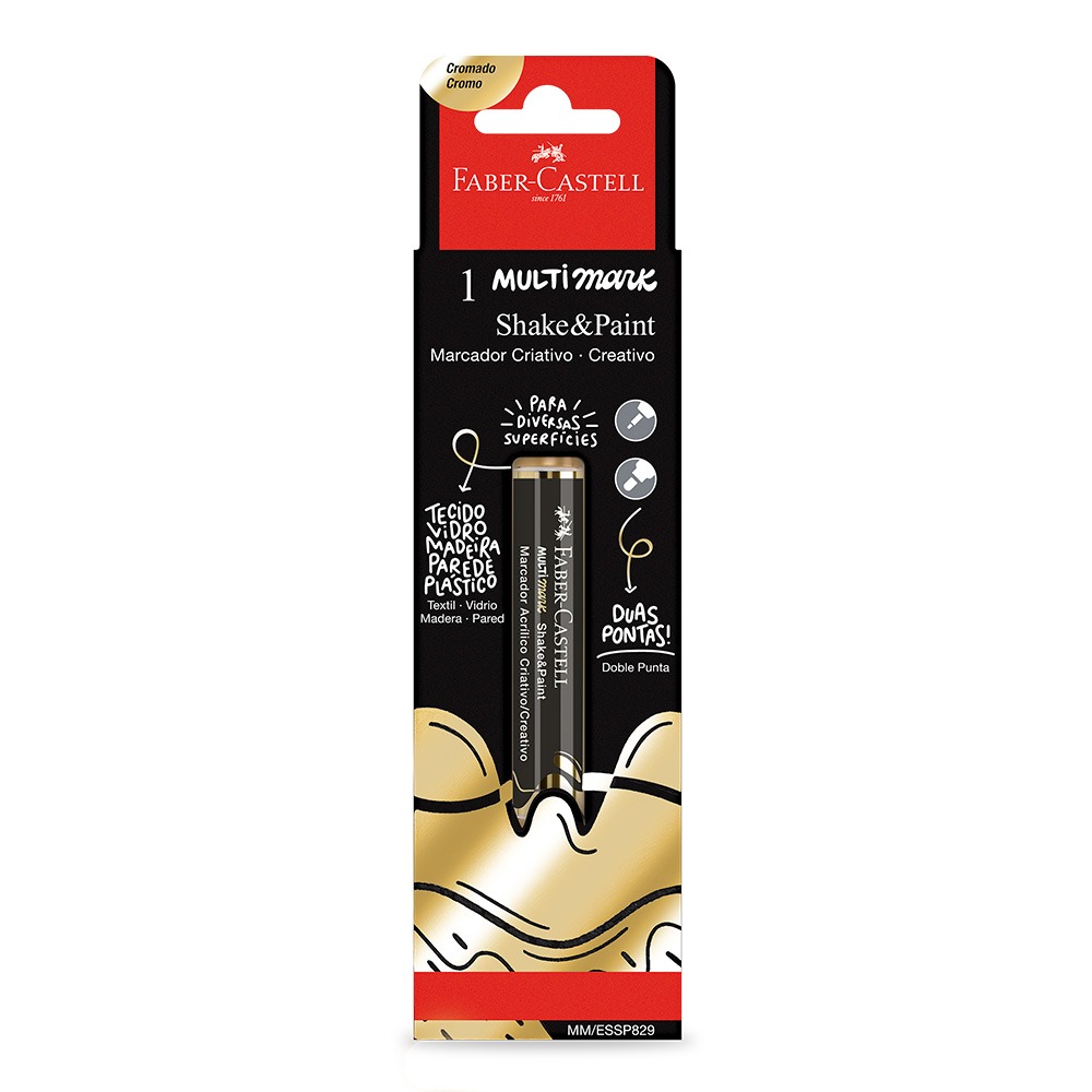 Adicione um toque de sofisticação e brilho aos seus projetos com o Marcador Multimark Shake&Paint Cromado Ouro da Faber-Castell. Com tinta acrílica de alta cobertura e efeito espelhado, este marcador é ideal para dar vida a trabalhos criativos em diversas superfícies como tecido, madeira, vidro, plástico e parede.