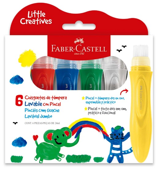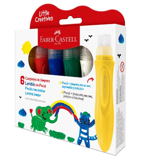 Desperte a criatividade dos pequenos com a Tinta Guache com Pincel Lavável Jumbo da Faber-Castell! Desenvolvido especialmente para mãos pequeninas, este kit da linha Little Creatives reúne praticidade e diversão: cada pincel vem com a tinta já acoplada, bastando apertar suavemente para liberar a cor. Ideal para crianças em fase de desenvolvimento motor, os pincéis anatômicos facilitam o manuseio e tornam a pintura mais intuitiva e sem sujeira. As tintas são laváveis e atóxicas, garantindo segurança durante o uso. Perfeito para atividades escolares e momentos criativos em casa.