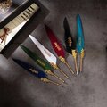Transforme sua escrita em uma verdadeira magia com a Caneta Tinteiro Pena Harry Potter! Inspirada no universo de Hogwarts, essa caneta elegante combina o estilo clássico das penas antigas com um toque encantador do mundo bruxo. O corpo da caneta é ricamente detalhado com um acabamento dourado e empunhadura com entalhes refinados, remetendo ao brasão das casas de Hogwarts.