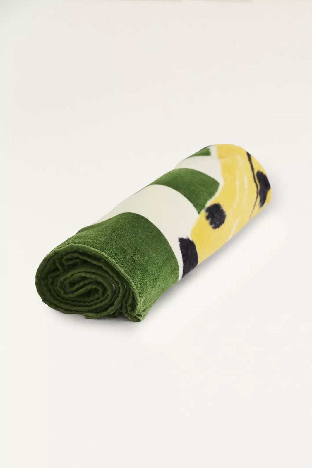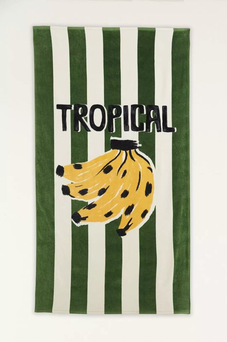 Dimensões aproximadas: 140 cm (altura) x 70 cm (largura) Composição: 100% algodão Detalhes: * Estampa exclusiva FARM Banana Tropical * Fundo listrado verde e branco * Toque macio e confortável * Ótima absorção e durabilidade * Ideal para praia, piscina ou uso diário