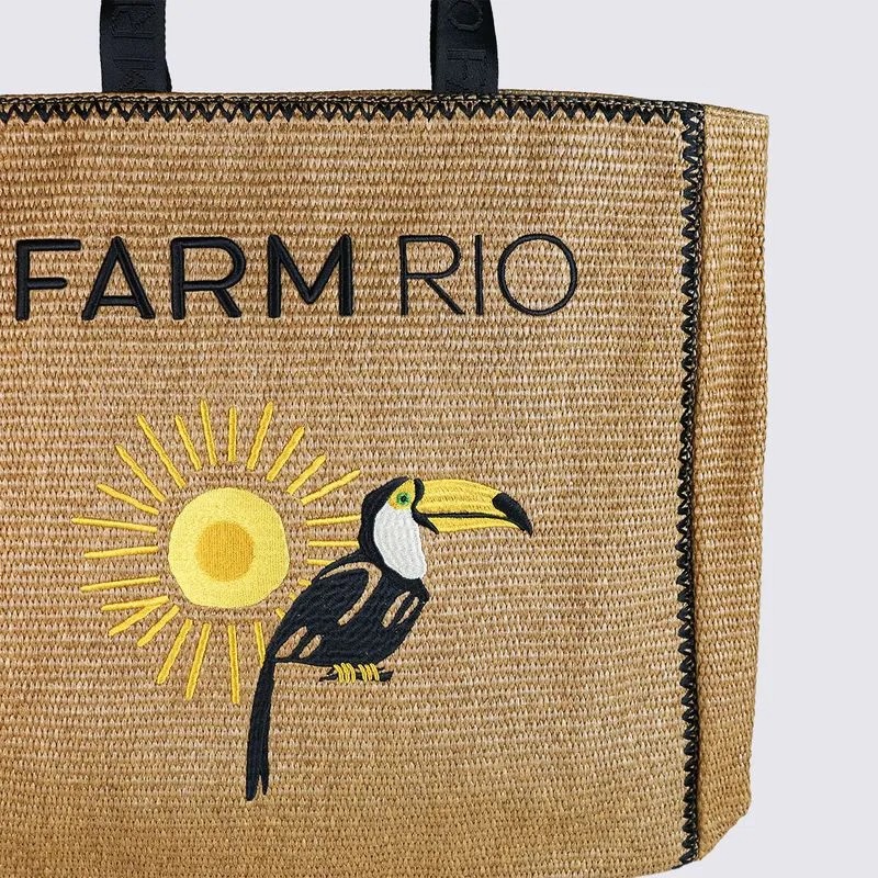 O modelo shopper é espaçoso e funcional, ideal para acomodar tudo o que você precisa com conforto e estilo. As alças em tecido preto trazem resistência e equilíbrio ao design, enquanto o logo FARM RIO bordado dá o toque final de autenticidade.