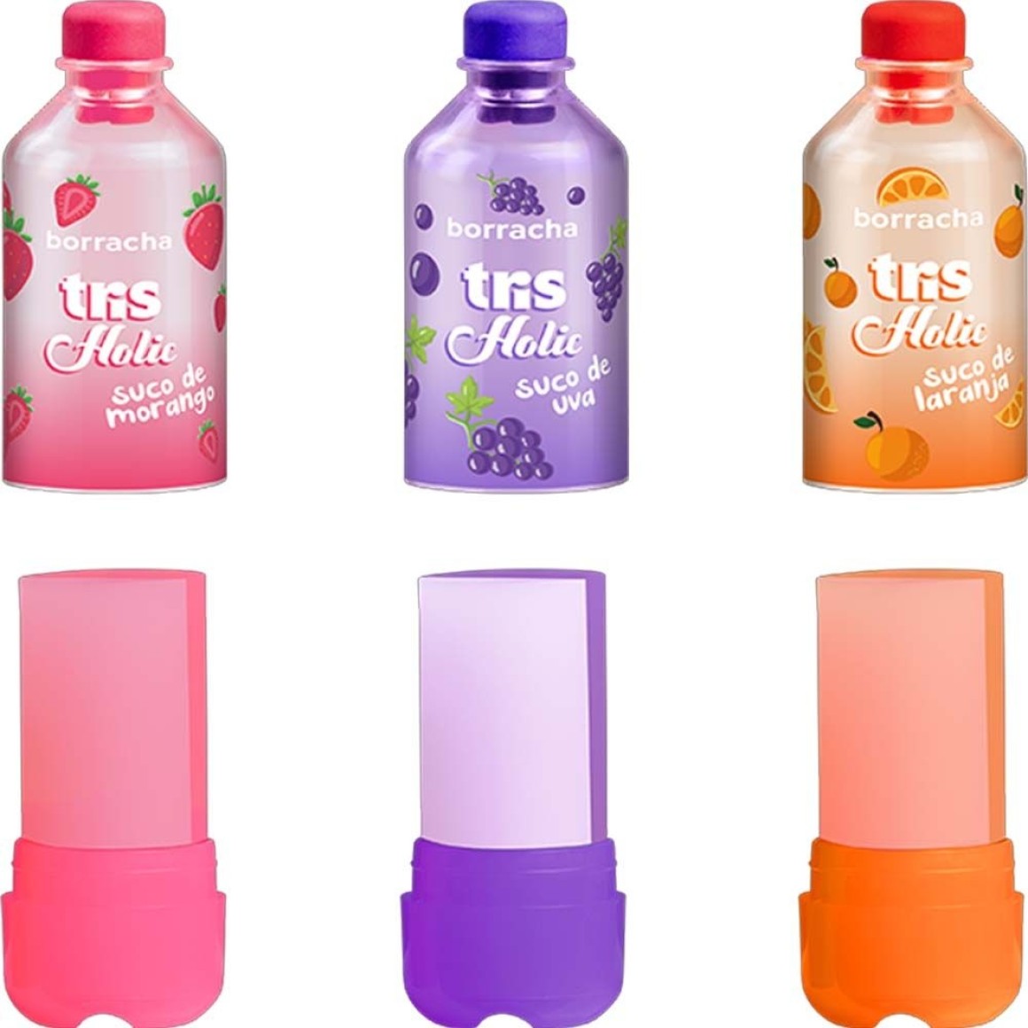 A Borracha Tris Holic Suco transforma o momento dos estudos em pura diversão! Com design criativo em formato de garrafinha de suco, ela vem em diferentes versões inspiradas nos sabores morango, uva e laranja. Além de linda e divertida, garante uma ótima performance ao apagar, sendo ideal para o dia a dia escolar.