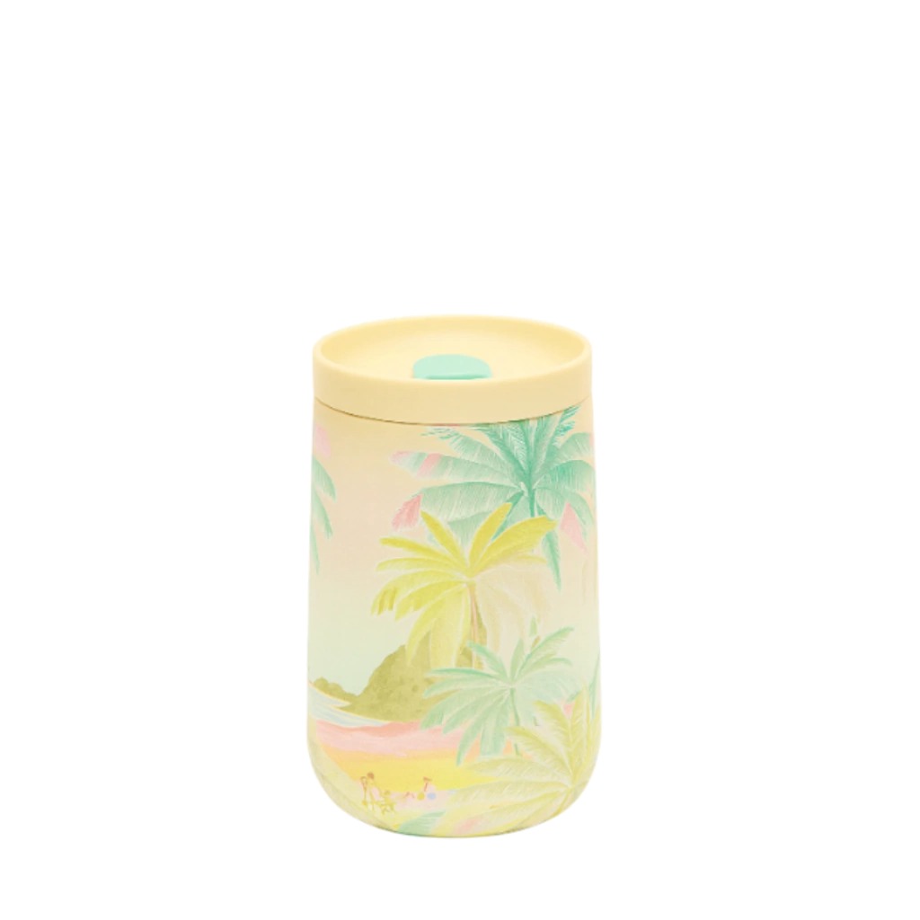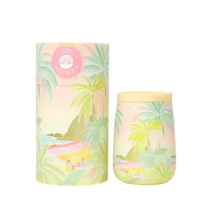 Traga o clima tropical para o seu dia com o Copo Farm Que Sede 450ml Fim de Tarde. Com uma estampa encantadora que retrata um pôr do sol à beira-mar entre coqueiros e tons suaves de verde, rosa e amarelo, este copo é perfeito para quem ama o estilo leve e colorido da Farm Rio.