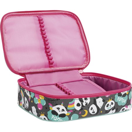 O interior é amplo e conta com divisória com elásticos, perfeita para organizar lápis, canetas, marcadores e outros itens de papelaria. O fechamento em zíper é resistente e mantém tudo seguro e protegido.